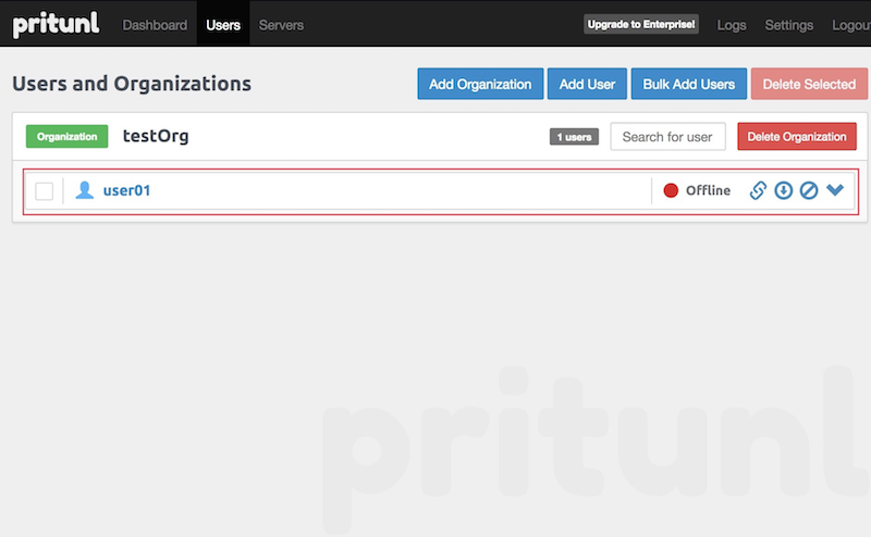 Pritunlは OpenVPNサーバ(Servers) を立てて、また組織(Organizations )を作成し、そこにユーザ(Users)を作成します。Server にOrganization をAttach することで、そのユーザがそのOpenVPNサーバを利用出来るようになります。