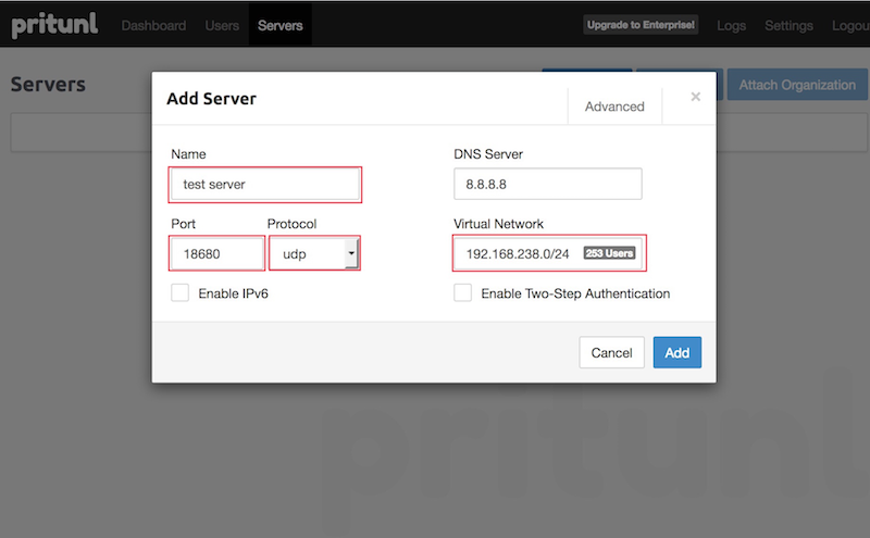 ルータのそとのグローバルアドレス: 111.101.12.xxx ルータのなかのネットワーク: 192.168.0.0/24 Pritunlサーバが構築する仮想ネットワーク: 192.168.238.0/24 ← Pritunlサーバが勝手に決めるぽい PritunlのWEB画面のSSLポート番号:443