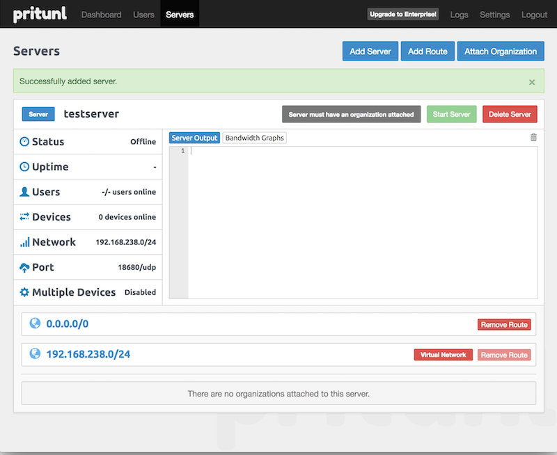 ようやくOpenVPNサーバを作成します。 右上の「Servers」をクリックし「Add Server」を選択します。 Nameは「test server」Portは自動選択されルっぽいですが、18680/udpを選択しました。