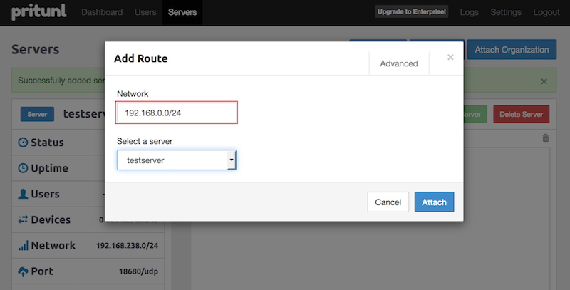 つづいてこのサーバがNATするネットワークを指定します。今回はこのOpenVPNサーバは、なかのネットワーク: 192.168.0.0/24にNATすればよいので、「Add Route」をクリックし、Networkに 192.168.0.0/24 を記述し「Attach」をおせばOKです。