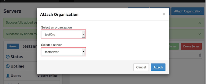 さいごに ServerとOrganization を Attach します。右上の「Attach Organization」を選択し、organizationとserverをそれぞれえらんで Attachを押せばOK。