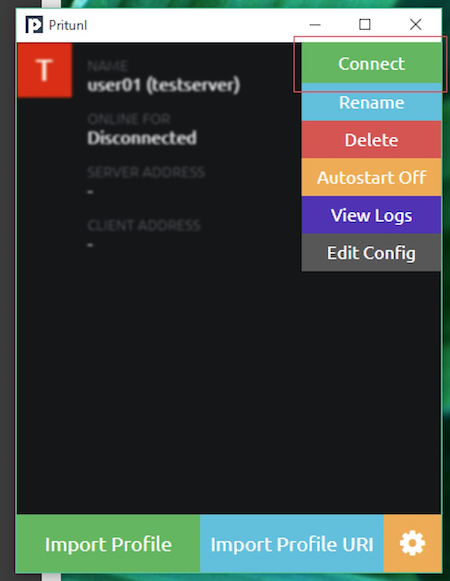 OpenVPNの公式のクライアントでもよいんですが、ここでは http://client.pritunl.com/ よりPritunl Clientを使用します。OSにあったインストーラを使用してインストールしてください。