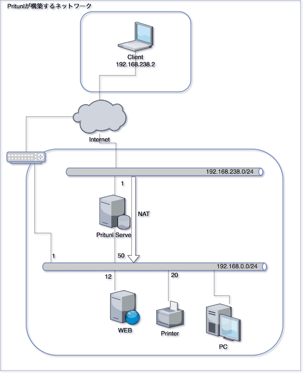 こんなネットワークが構築され、Pritunl Server(192.168.0.50 のサーバ)が、クライアントの接続を中継する形となります。*1