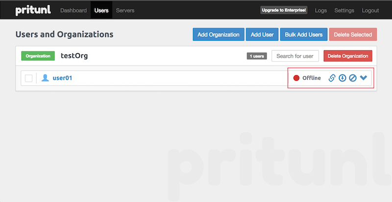 さきほどのユーザ画面よりユーザのプロファイルを取得します。右上の Users をクリックし、画面の 下矢印アイコンをクリックして、プロファイル( testOrg_user01_testserver.ovpn をアーカイブしたtarファイル)をダウンロードします。