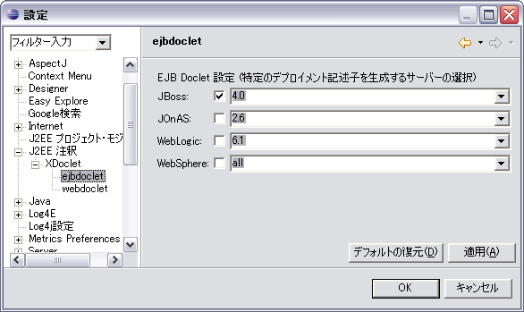 ウィンドウ > 設定 >> J2EE注釈 >> XDoclet