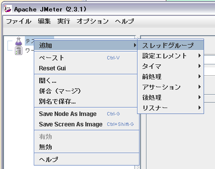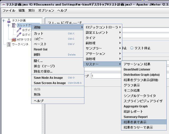先ほどサーバに負荷をかけしましたが、レスポンスタイムやスループットがどれくらいでているかはリスナーという機能で見ることができます。スレッドグループを右クリックし