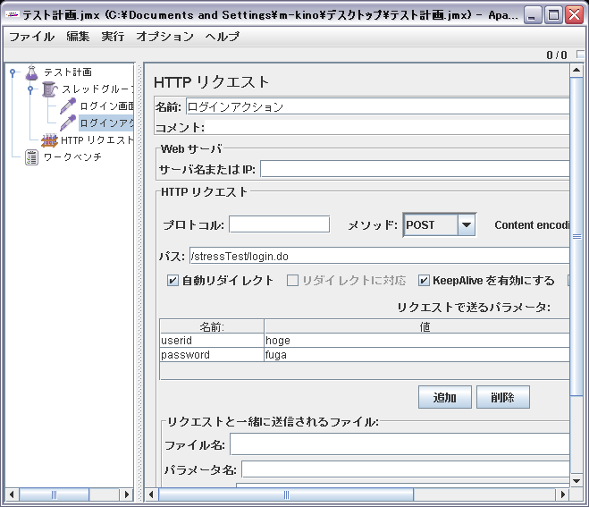 別のサンプラも作ってみます。ログイン画面表示後の次のアクションであるログイン処理のサンプラを作成します。下記のようにスレッドグループの下にログインアクションを追加しました。このログインアクションはクエリとして userid,password を取るので「リクエストで送るパラメータ」の欄にパラメタとして追加してあります。パラメタの値は可変である場合が多いですが、サンプルは固定で問題ないのでと、りあえず固定で値hoge,fugaを設定しています。