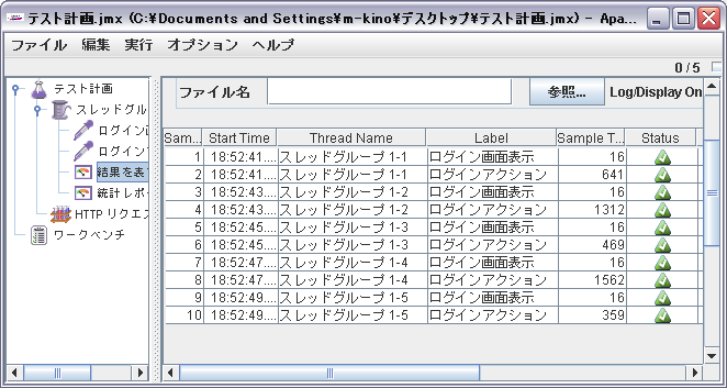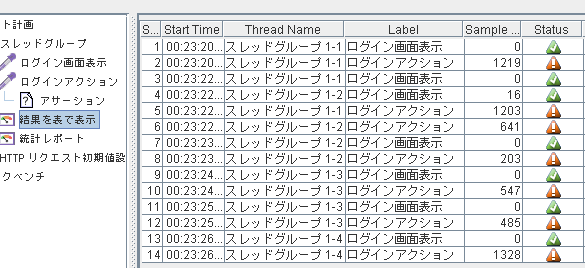 これでテスト実行しましょう。アサーションの結果は先のリスナ「結果を表で表示」で確認することができます。パスワードなどが間違ってて、戻りhtmlに「ログインできました!」という文字列が含まれていなかった場合は、ステータスが「!」などになるわけですね。