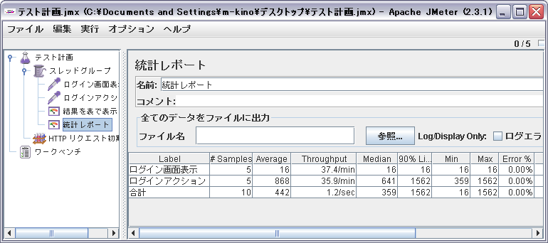 これらのリスナーはいわゆるレポート機能で「結果を表で表示」はリクエストごとのレスポンスタイムを見ることができます。「統計レポート」はサンプラーごと(=画面ごと)の平均*2レスポンスタイム、スループットなどを見ることができます。