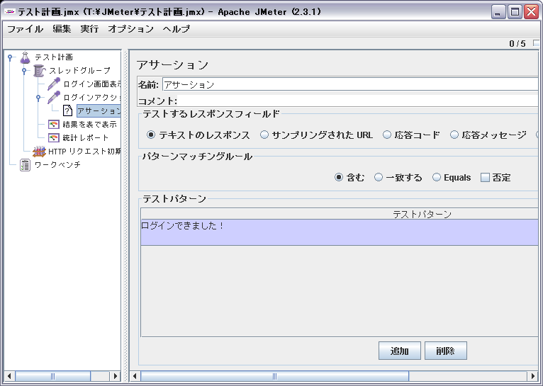 アサーションの画面ではどのようなアサーションを行うかを指定します。下の例では、ログイン後に返ってくるhtml内に「ログインできました!」という文字列が含まれているかどうかをチェックしています。