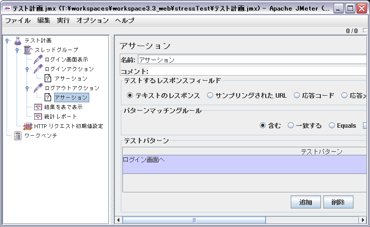 ログアウトアクションのサンプラを作成したあと、正しくログアウトができてることを確認するためアサーションも追加します。正しくログアウトできたら「ログイン画面へ」という文字が含まれたhtmlが返却されるので、それをアサーションすることにします。