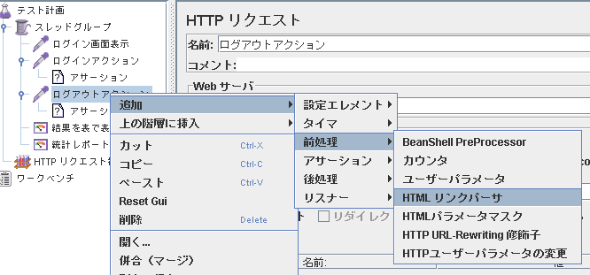 さて前画面の値をリクエストにセットするには「HTMLリンクパーサ」という機能を使用します。ログアウトアクションで右クリックし、