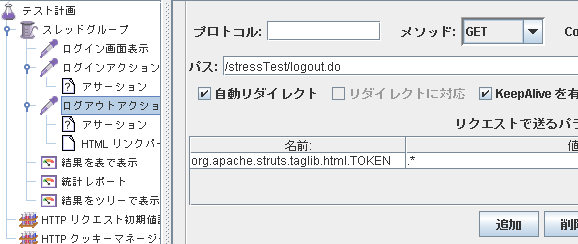 続いてログアウトのサンプラを追加したいと思いますが、先の通りログアウトアクションはトークンチェックをしています。具体的にはパラメタとして