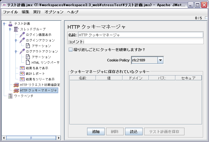 また、トークンはJ2EEセッションがつながっている必要があるため、Cookieを送出するよう設定を追加します*4。追加方法はテスト計画を右クリックし